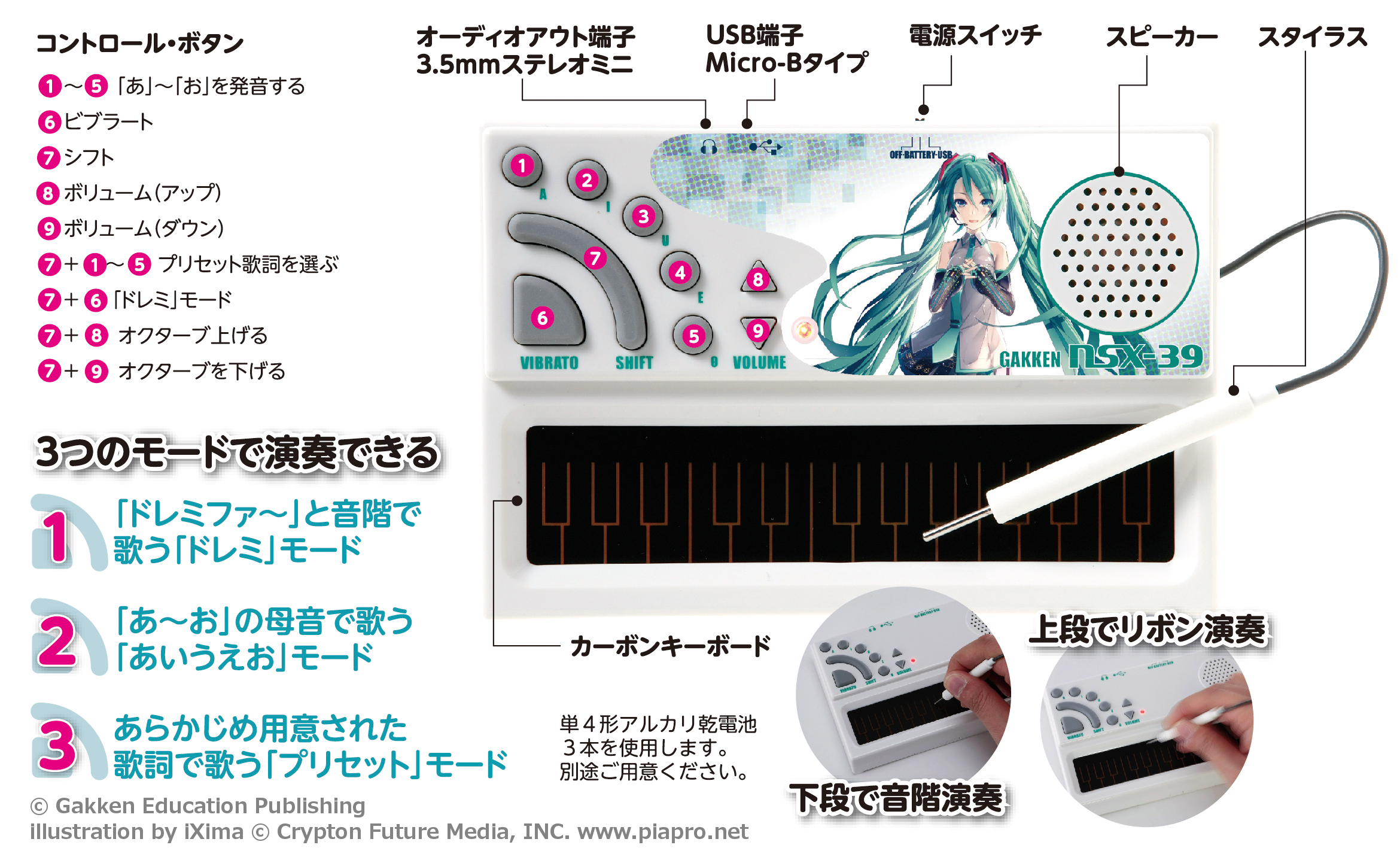 電源を入れ、キーボードを「ドレミ」とタッチすれば、内蔵スピーカーから「ドレミ」と『初音ミク』の歌声が響きます。また、コントロール・ボタンの「1~5」を押すと、「あ~お」の母音で歌わせることができます。さらに、あらかじめ用意された歌詞で歌う「プリセット」モードで歌詞を選べば、誰もが知っている歌を歌わせることが可能です。ビブラートやオクターブの上下機能を駆使して、表情豊かに歌わせるなど、様々な表現を楽しめます。