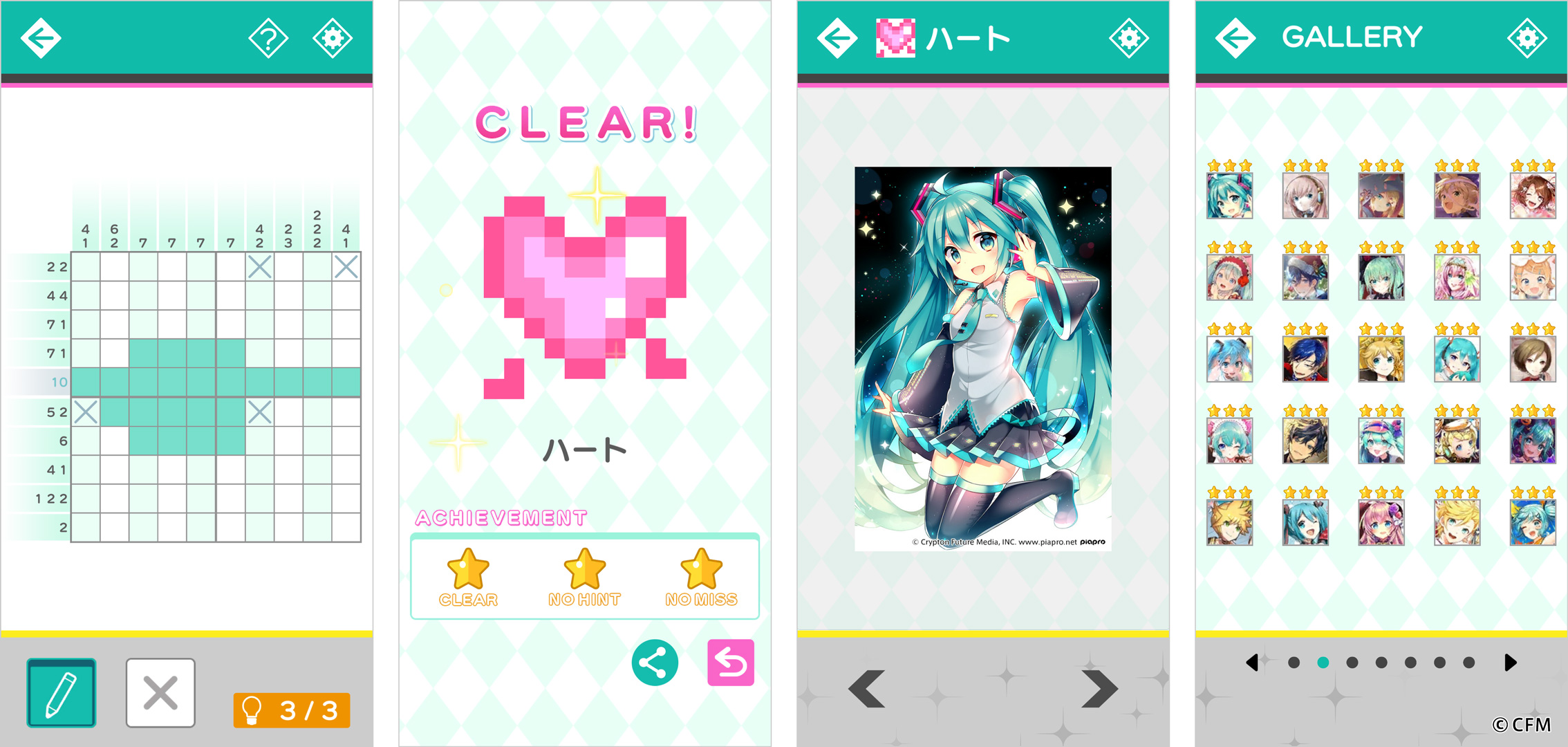 「初音ミク ロジックペイント -ミクロジ-」は、方眼状のパズルの上部と左部にある数字をヒントにマスを塗りつぶして、パズルを完成させるゲームです。パズルを完成させるとピアプロキャラクターズの様々なイラストが解放され、ギャラリーとしてコレクションすることが可能になります。