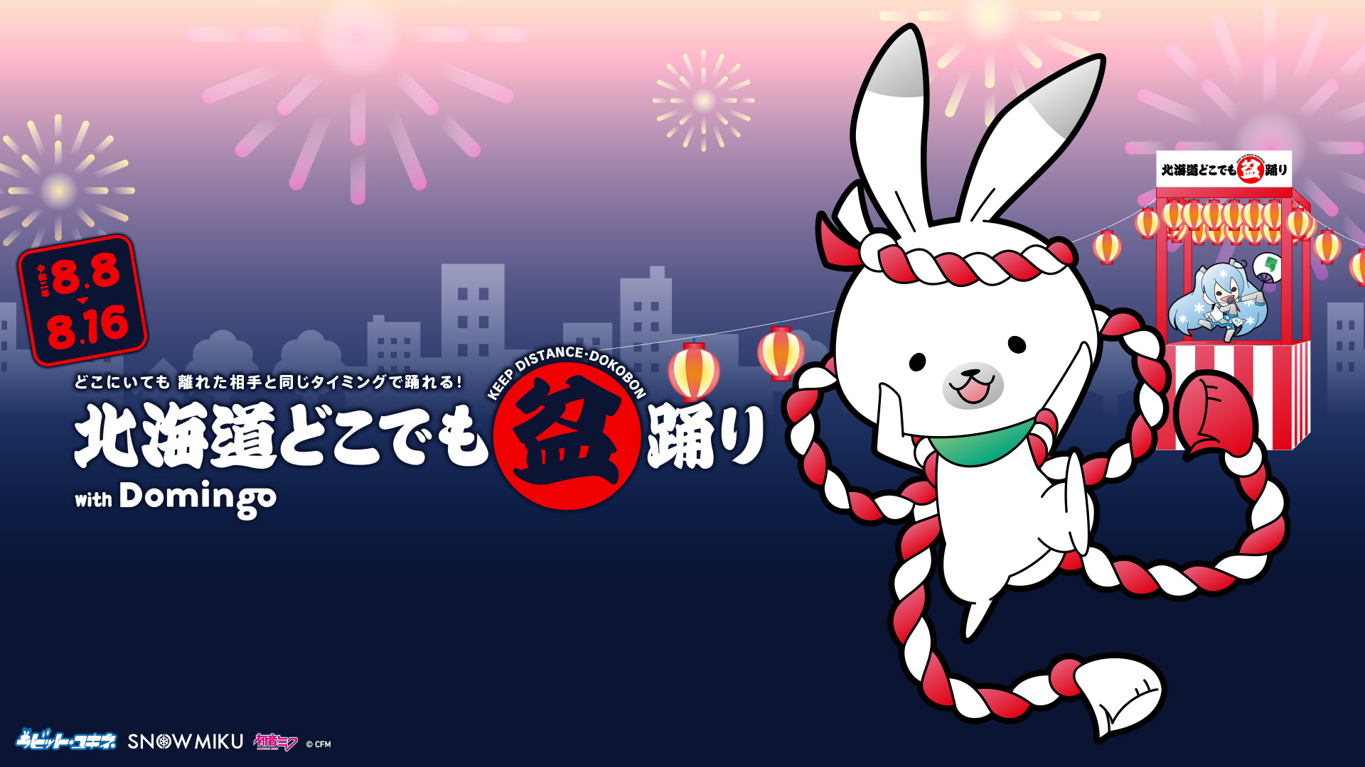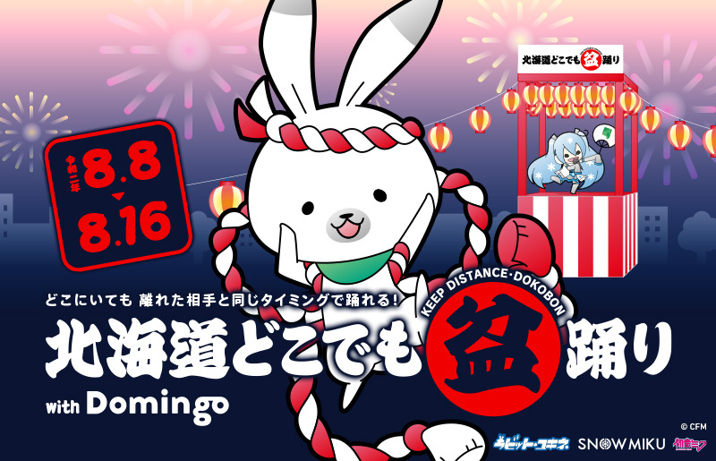 クリプトン・フューチャー・メディア株式会社(本社:北海道札幌市、代表取締役:伊藤博之、以下クリプトン)は、当社が取り組む地域振興事業(プロジェクト名:「Domingo(ドミンゴ)」)の一環として、「北海道どこでも盆踊り with Domingo」のオンライン開催を決定いたしました。開催期間は2020年8月8日(土)17:00から、8月16日(日)22:00まで。スマートフォンでお楽しみいただける、ウィズコロナ時代ならではの”ソーシャルディスタンス盆踊り”です。