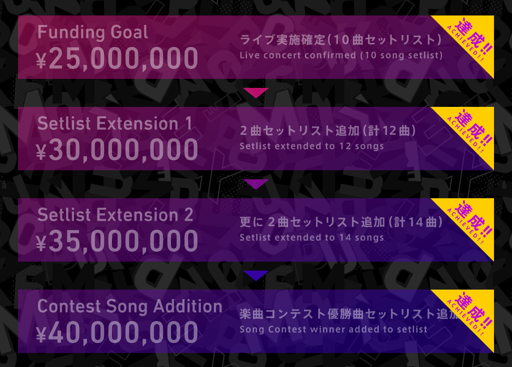 The campaign was launched on the crowdfunding platform Kickstarter on Thursday, November 12 2020 at 11:00 a.m. Thanks to the overwhelming support of fans, it reached its initial goal of 25 million yen within just nine hours after it started. In addition, all stretch goals, which set out to add songs to the set list among other items, were reached with a total amount of over 40 million yen on the fifth day of the project, securing the addition to the set list of the song contest winning song.