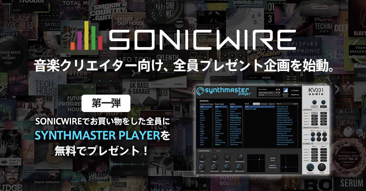 クリプトン・フューチャー・メディア株式会社(本社:北海道札幌市、代表取締役:伊藤博之)は、自社が運営するデジタルクリエイター向けダウンロードストア『SONICWIRE(ソニックワイヤ)』に、音楽クリエイター向けの製品プレゼント機能を追加いたしました。本機能を活用したキャンペーンの第一弾として、2021年2月25日(木)~4月16日(金)17:00までの期間限定で、プレゼント企画を実施。期間中に『SONICWIRE』でショッピングしていただいたお客様に、シンセサイザー音源「SYNTHMASTER PLAYER(シンセマスター プレイヤー)」を無料プレゼントいたします。