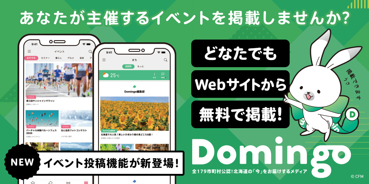 『Domingo』は道内の全179市町村公認の北海道メディアとして、これまでに北海道に関するイベント情報を延べ2万件以上掲載してまいりました。しかし、長引く新型コロナウイルス感染症(COVID-19)の影響で、近年はイベントの延期や中止が多発。多くのイベント主催者にとって、苦しい日々が続いている状況です。