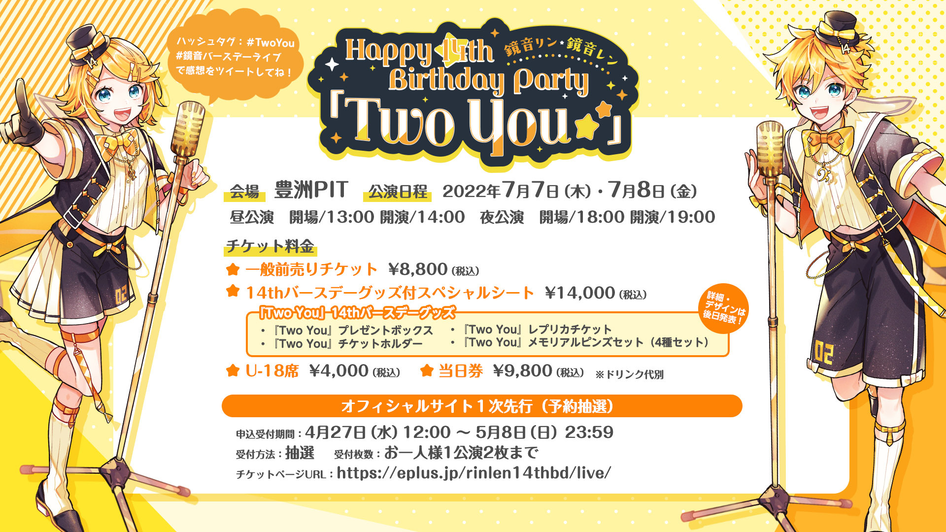 『鏡音リン・レン Happy 14th Birthday Party「Two You☆★」』に関する情報は、下記公式WEBサイト・Twitterアカウントより、随時発信しております。14年間2人を支えてくださった皆様への感謝を込めて展開してまいりますので、『鏡音リン・レン』のメモリアルな14周年を一緒にお祝いしましょう!