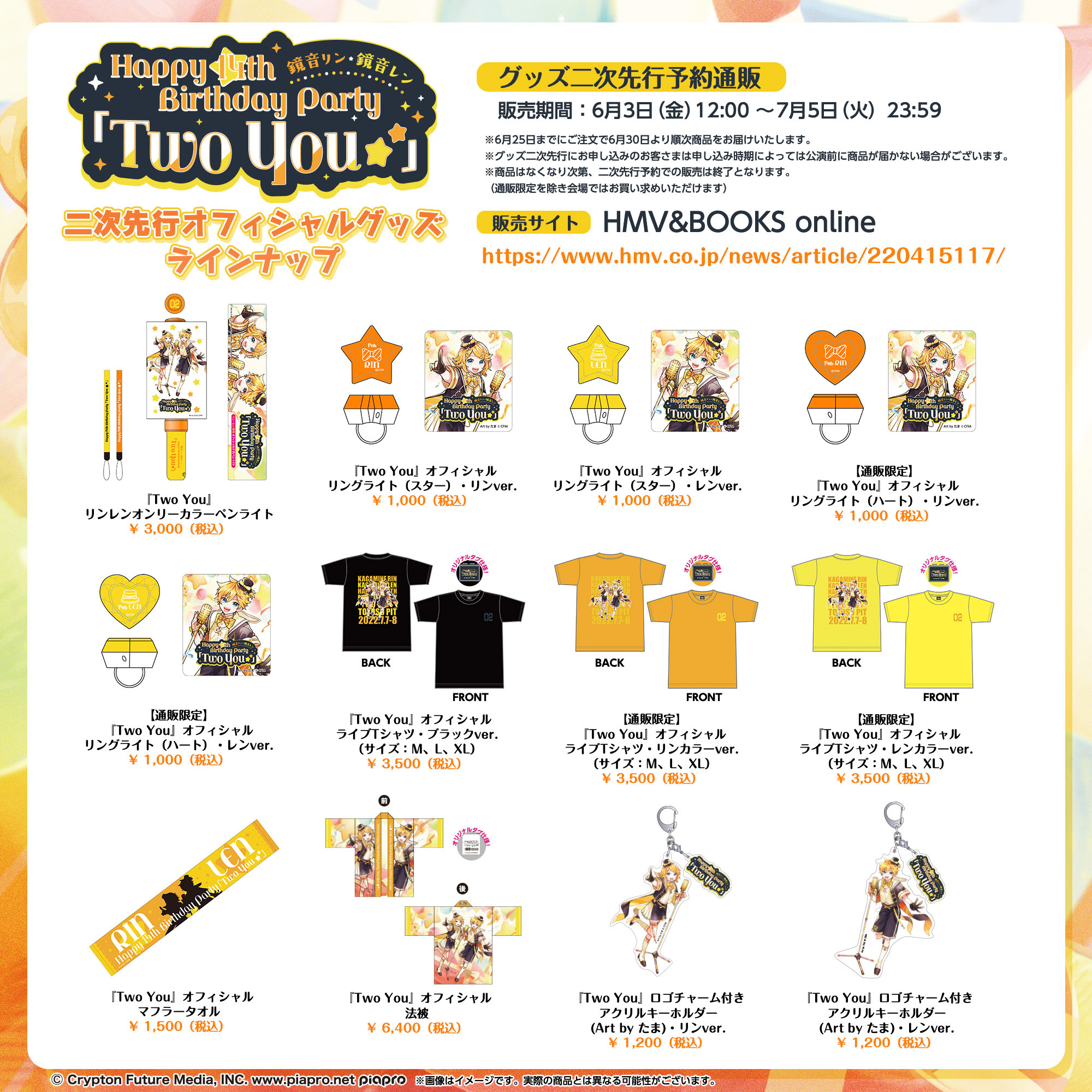 クリプトン・フューチャー・メディア株式会社(本社:北海道札幌市、代表取締役:伊藤博之、以下クリプトン)は、株式会社フライングドッグ(本社:東京都渋谷区、代表取締役:佐々木史朗)との共催で開催する3DCGライブ『鏡音リン・レン Happy 14th Birthday Party「Two You☆★」』について、2022年7月8日(金)に実施する夜公演のライブ配信を追加決定いたしました。配信チケットの申込受付は、6月3日(金)12:00より開始いたします。また本日、サブビジュアルとグッズ二次先行予約通販に関する情報も新しく公開いたしましたので、配信情報とあわせてご確認ください。