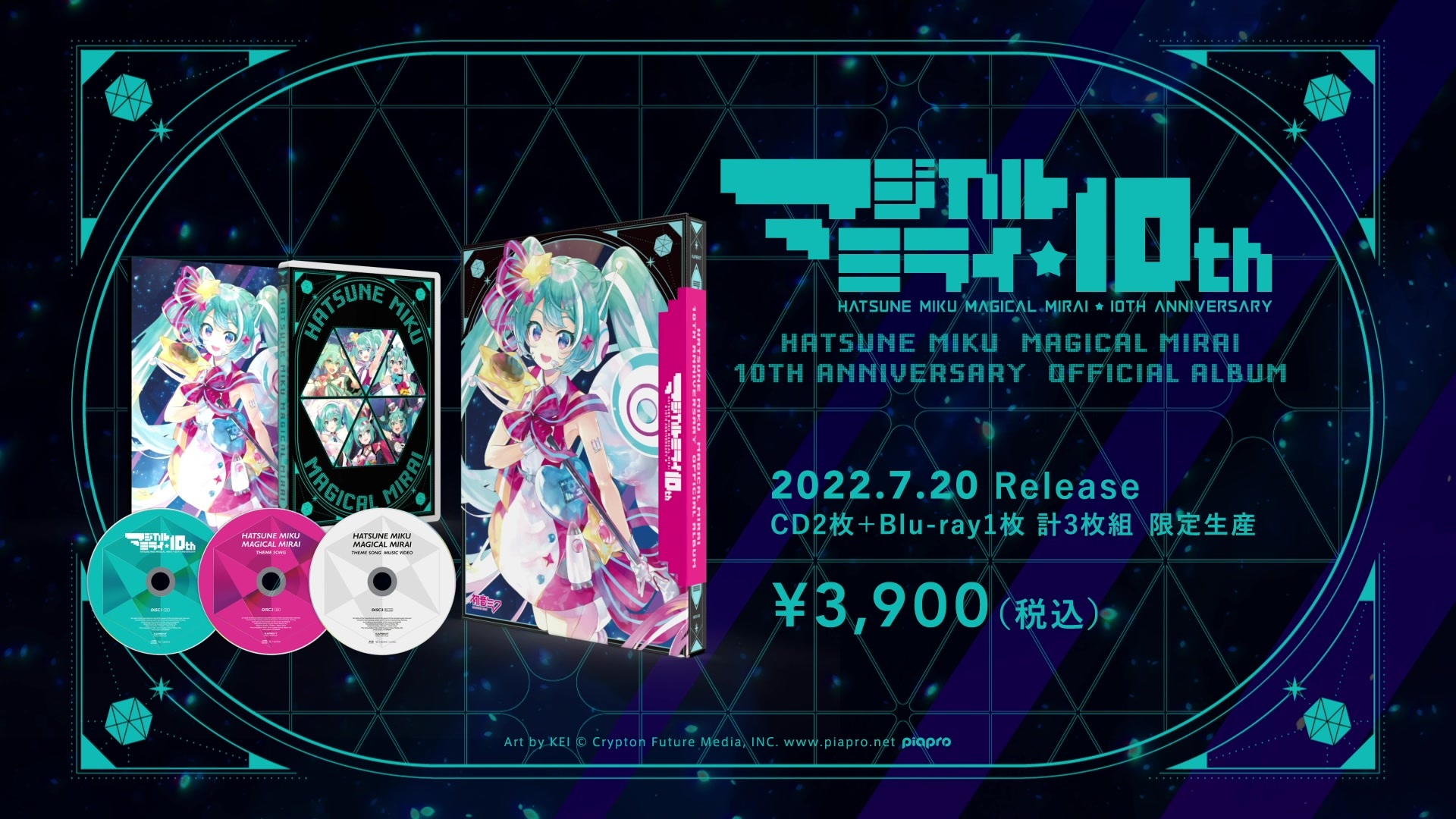クリプトン・フューチャー・メディア株式会社(本社:北海道札幌市、代表取締役:伊藤博之)は、運営するボーカロイド音楽専門レーベル「KARENT(カレント)」より、新作CDアルバム『初音ミク「マジカルミライ」10th Anniversary OFFICIAL ALBUM』をリリースいたしました。発売日は、2022年7月20日(水)。8月のOSAKAを皮切りに、TOKYO、SAPPOROと3会場で開催するイベント『初音ミク「マジカルミライ」10th Anniversary』(以下「マジカルミライ 10th」)のライブで披露予定の楽曲を収録したアルバムです。また、OSAKA・TOKYO会場内で実施する音楽即売イベント「KARENT Presents クリエイターズマーケット」(以下「クリエイターズマーケット」)の最新情報も発表となりました。あわせてご確認ください。