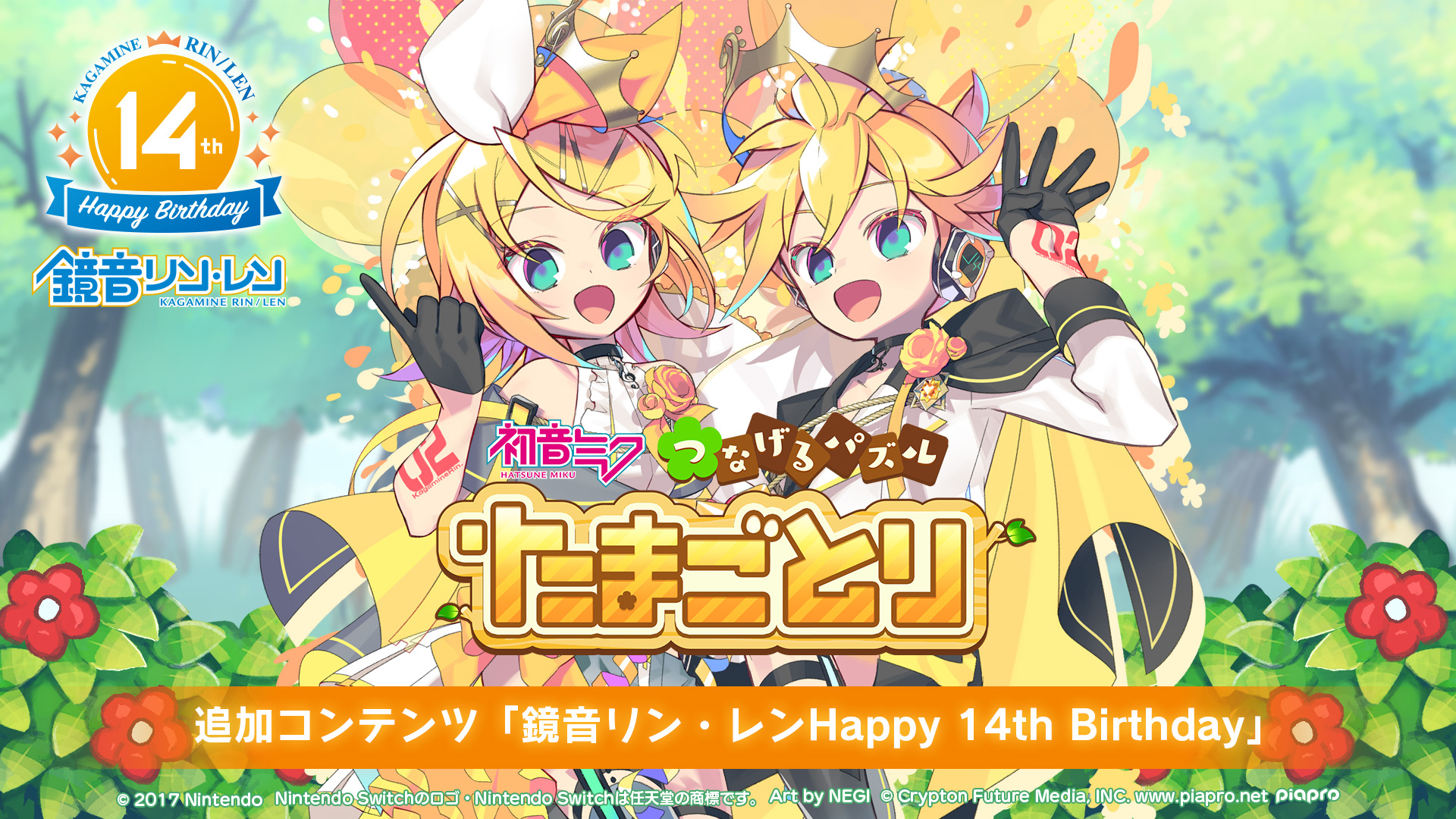 本日発売の追加ダウンロードコンテンツ第2弾は、2007年に「14歳」という設定で誕生した『鏡音リン・レン』の「14回目の誕生日」を祝うプロジェクト「鏡音リン・レン Happy 14th Birthday」の一環で生まれました。ステージクリアでご覧いただけるイラストに、イラストレーター・NEGIさんによる記念ビジュアルが追加されるほか、『鏡音リン』『鏡音レン』がモチーフの新しいタマゴや鳥が登場します。