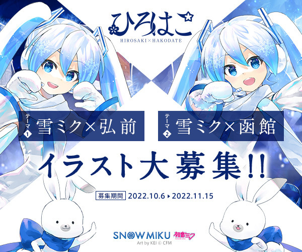 クリプトン・フューチャー・メディア株式会社(本社:北海道札幌市、代表取締役:伊藤博之、以下クリプトン)が展開する北海道を応援するキャラクター『雪ミク(初音ミク)』は、青森県弘前市と北海道函館市が相互誘客や周遊観光の促進等を図る目的で展開している連携事業「ひろはこ」の冬季観光キャンペーンに協力いたします。また、本日より2022年11月15日(火)まで、両市と『雪ミク』をテーマにしたイラストコンテストを開催。入選作品は弘前市および函館市の観光施設に展示するとともに、2023年夏頃に制作予定のアフターレポート動画にも採用いたします。ぜひご参加ください。