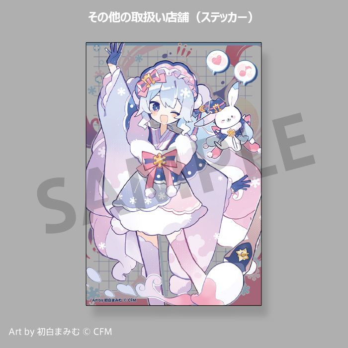 2023年1月25日(水)~、新千歳空港 雪ミク スカイタウン、アニメイト一部店舗(北海道内店舗、池袋本店、秋葉原本館、大阪日本橋店、名古屋店、通販)、全国のHMV、HMV&BOOKS online等で販売を開始。初白まみむさんの描き下ろしイラストを使用した店舗別特典はなくなり次第終了となりますので、ぜひお早目にお買い求めください。