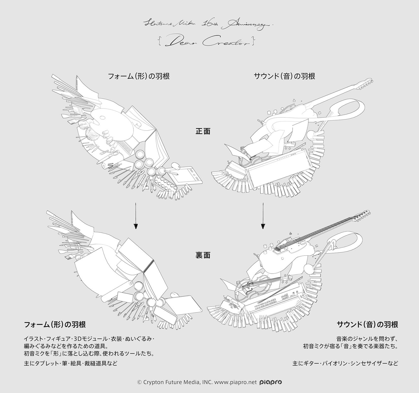 この新プロジェクトのためにデザインしていただいたオリジナル衣装には、これまでに販売された歴代ソフトウェアの衣装モチーフが含まれているので、ぜひ各要素を探してみてください。また、『初音ミク』の後ろには創作活動の手助けとなる象徴的なツールが集まった「創作の羽根」が描かれており、まさに多くのクリエイターの作品とともに16年間を歩んできた『初音ミク』らしいビジュアルとなっています。