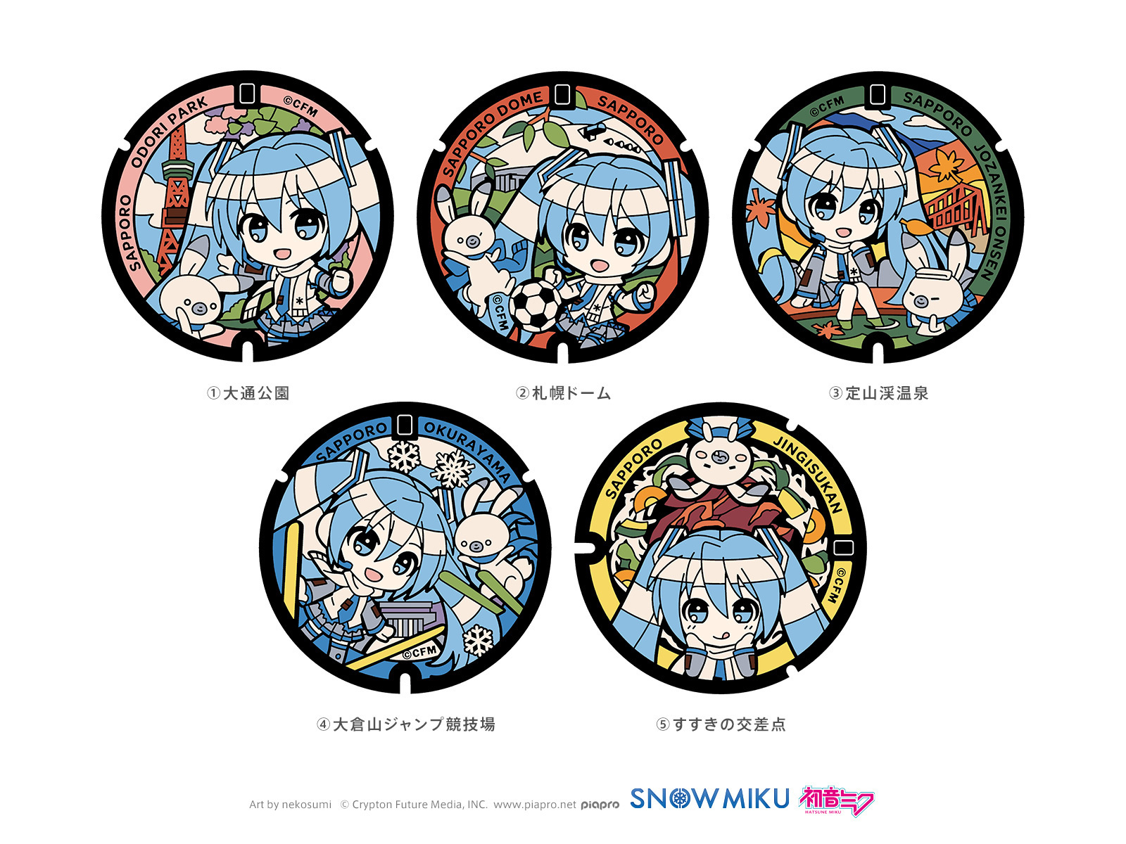 『雪ミク』と『ラビット・ユキネ』がデザインされたマンホール蓋は、大通公園(西4丁目)、札幌ドーム(ドーム前広場付近)、定山渓温泉(月見橋)、大倉山ジャンプ競技場(噴水前)、すすきの交差点(南4条西3丁目北側)の計5ヶ所に設置される予定です。マンホールのデザインは『ラビット・ユキネ』原案者でもあるイラストレーター・nekosumiさんが担当。『雪ミク』と『ラビット・ユキネ』が四季を感じる観光名所やご当地グルメを楽しむ様子を、愛らしく描いていただきました。