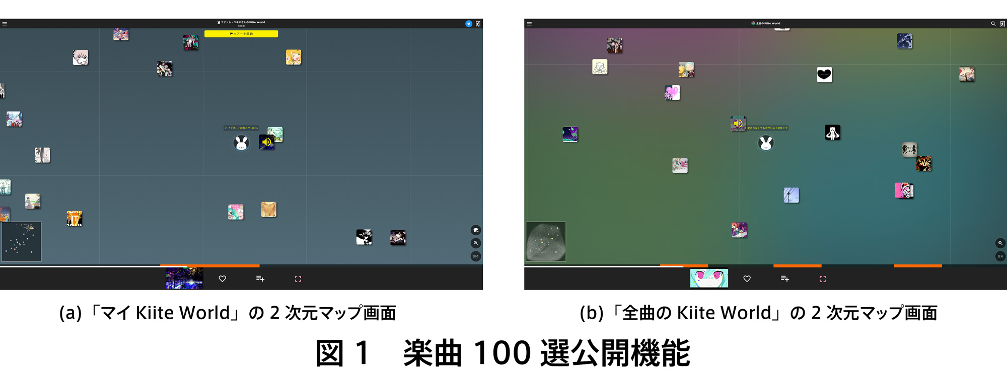 好きな100曲(100選)を選んで「マイKiite World」(自分の音楽世界)として公開すると、公開者のアカウント名と共に「みんなのKiite World」の一覧表示に列挙される。その中の一つを視聴者が選択して訪問すると、その「マイKiite World」の100曲が2次元マップ上に配置されて可視化される(図1(a))。視聴者はマップ上の自分のアイコンを自由に移動して、楽曲のどれかに重ねて選択すると、それを再生したり、プレイリストや「お気に入り」リストに追加したりできる。マップは自分のアイコンの周囲だけが拡大されてスクロール表示されるが、左下にマップ全体の縮小版も表示されていて、楽曲の配置と自分の位置を確認できる。なお、「マイKiite World」は100曲に満たなくてもよいが、各視聴者は一つしか公開できない。また、自分では公開せずに、訪問して音楽発掘だけをしてもよい。