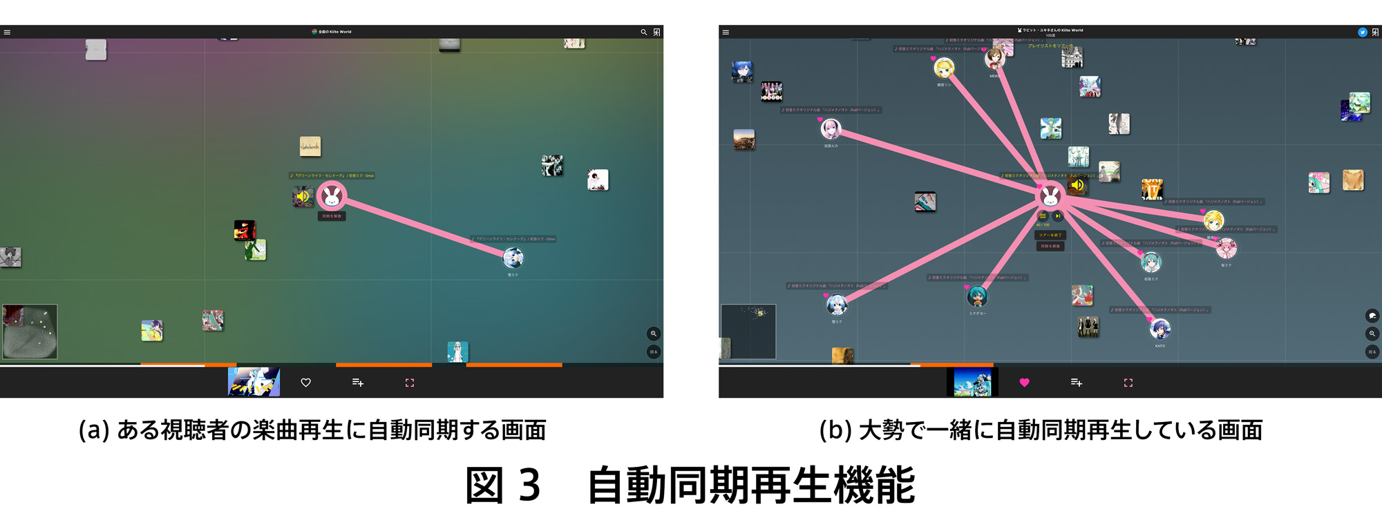 ある視聴者の楽曲再生に興味を持ったら、その視聴者の楽曲再生に自動的に同期して、同じ音楽世界で同じ楽曲を同じタイミングで自分も一緒に聴けるように設定できる(図3(a))。設定を解除するまでは、その視聴者がマップ上で次の楽曲の再生に移っても同期再生し続けるので、次々と楽曲を一緒に聴くことができる。これにより、同期される側は自分の好きな楽曲を広める機会が増え、同期する側は新たな楽曲に出会う機会が増える。