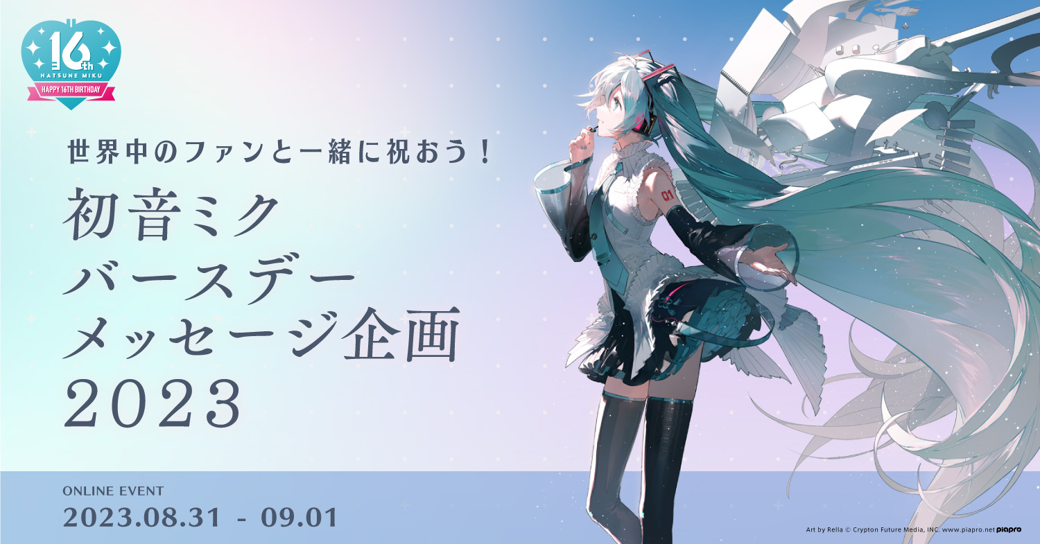 設定年齢「16歳」として生まれたミクにとって、16周年は特別な節目です。記念プロジェクト「初音ミク Happy 16th Birthday –Dear Creators-」(https://piapro.net/miku16thbd/)では「16年間に生まれた『初音ミク』、これから生まれる未来の『初音ミク』。全てのクリエイターに祝福を。」をコンセプトに、創作の輪がさらに拡がっていくことを願って様々な企画を展開しております。「初音ミク バースデーメッセージ企画2023」も、この記念プロジェクトの一環です。