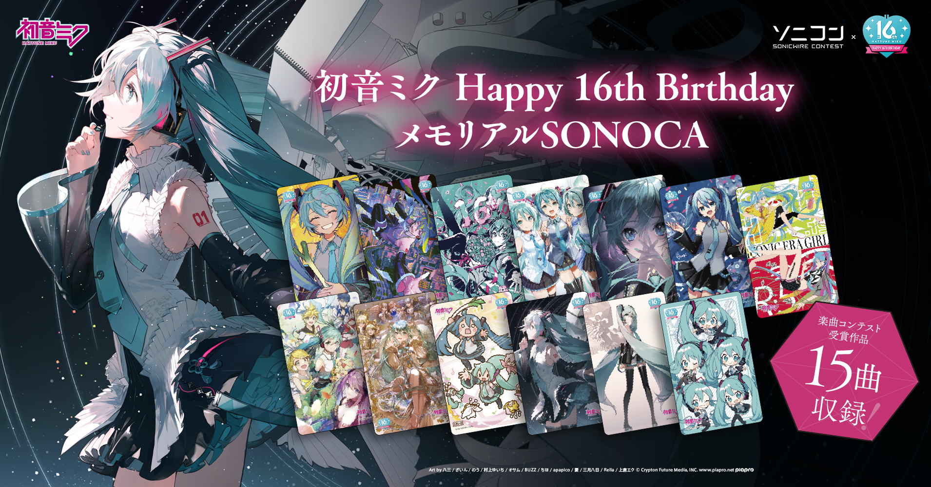 このたび、初音ミク16周年プロジェクト「初音ミク Happy 16th Birthday -Dear Creators-」の一環で制作した「初音ミク Happy 16th Birthday メモリアルSONOCA」には、同プロジェクトの楽曲コンテスト「ソニコンコラボ: -初音ミク Happy 16th Birthday- 編」(https://sonicwire.com/news/special/sonicon-miku-16th)で入賞した全15作品を収録。初音ミクが歌唱する多様な15曲をお楽しみいただけます。