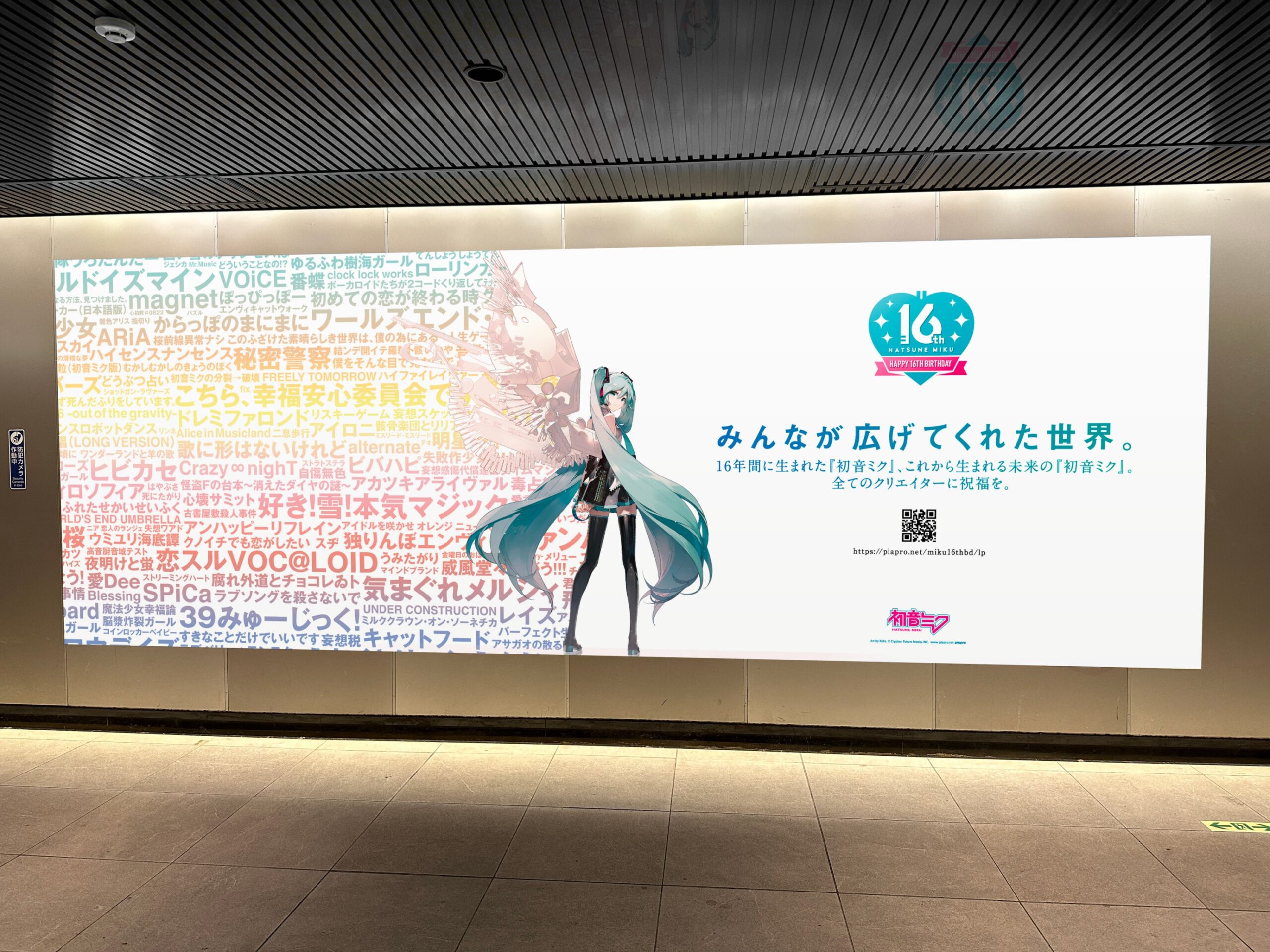 来たる2023年8月31日に、初音ミクは「16回目の誕生日」を迎えます。2007年8月31日に設定年齢「16歳」の音楽ソフトウェアとして生まれたバーチャル・シンガー初音ミクにとっては、たった一度きりの特別な節目です。この特別な節目を祝して、2023年8月28日(月)より順次、全国5都市(札幌、東京、名古屋、大阪、福岡)で初音ミクの広告展開を実施いたします。様々な掲示方法で展開いたしますので、街中で見かけた際にはぜひご覧ください。