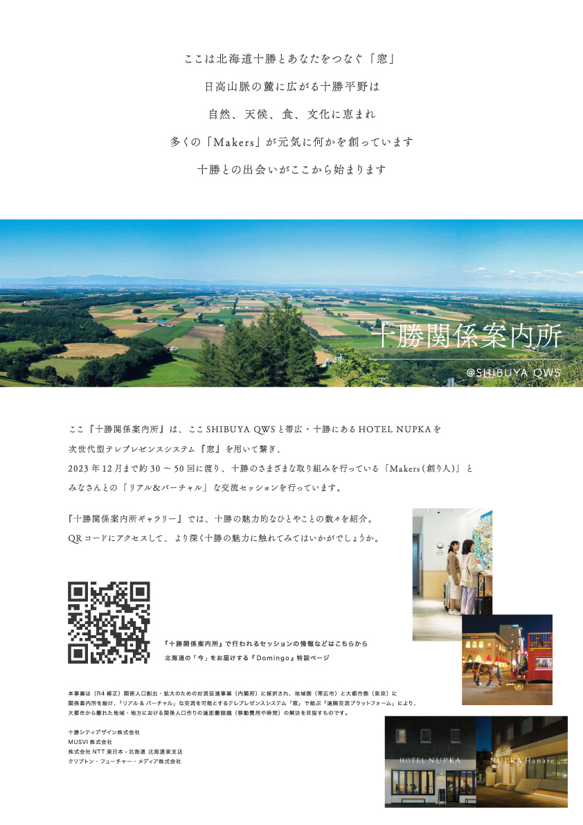 本事業では、地域側(北海道帯広市・HOTEL NUPKA)と首都圏側(東京都渋谷区・SHIBUYA QWS)の双方に「十勝関係案内所」を設け、リアル&バーチャルな交流を可能とするテレプレゼンスシステム「窓」(MUSVI株式会社)を設置。2つの関係案内所を結ぶ「遠隔交流プラットフォーム」を構築し、北海道十勝エリアと首都圏をデジタルコミュニケーションツールによって繋ぎます。また、地域人材の交流と十勝への来訪を誘発するため、十勝でモノ作りやコト作りを行う「Makers(創り人)」の取り組みを紹介する「関係案内セッション」を、2023年9月から12月までに約30~50回ほど実施する予定です。