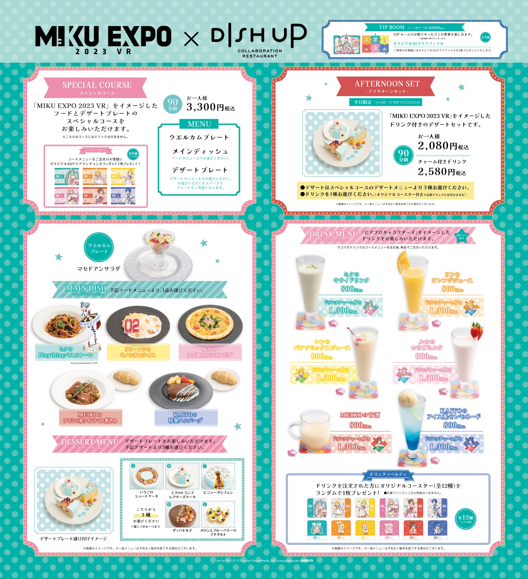 さらに、本イベントの開催にあわせて実施されるコラボレーション企画「HATSUNE MIKU EXPO 2023 VR × DISH UP」の詳細情報も、2023年10月18日(水)付けで解禁となりました。おもちゃ箱を開けるようなワクワク体験をお楽しみいただけるフード・ドリンクメニューや販売グッズのラインナップが公開されましたので、ぜひ「DISH UP」公式WEBサイトよりご確認ください。コラボレーション期間は、2023年11月10日(金)~12月10日(日)まで。2023年11月12日(日)には、店内で「HATSUNE MIKU EXPO 2023 VR」コンサート本編のライブビューイングを行います。