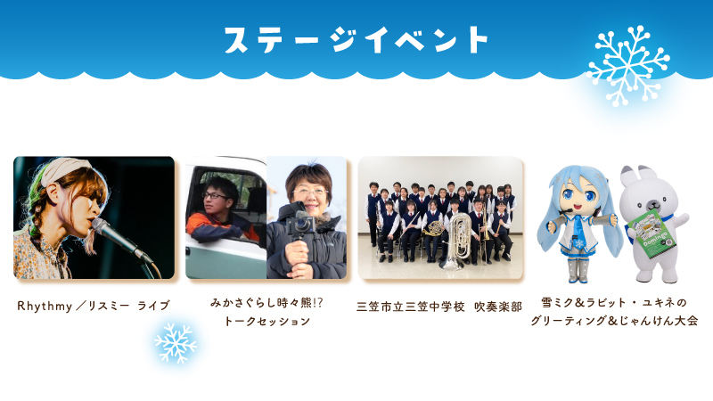会場内に設けられるミニステージでは、三笠中学校吹奏楽部による演奏をはじめ、アーティストライブ、トークセッションなど楽しいステージイベントを開催! 北海道を応援するキャラクター『雪ミク』&『ラビット・ユキネ』も三笠を応援するために、クリスマスイブのイオンスーパーセンター三笠店に駆けつけます。