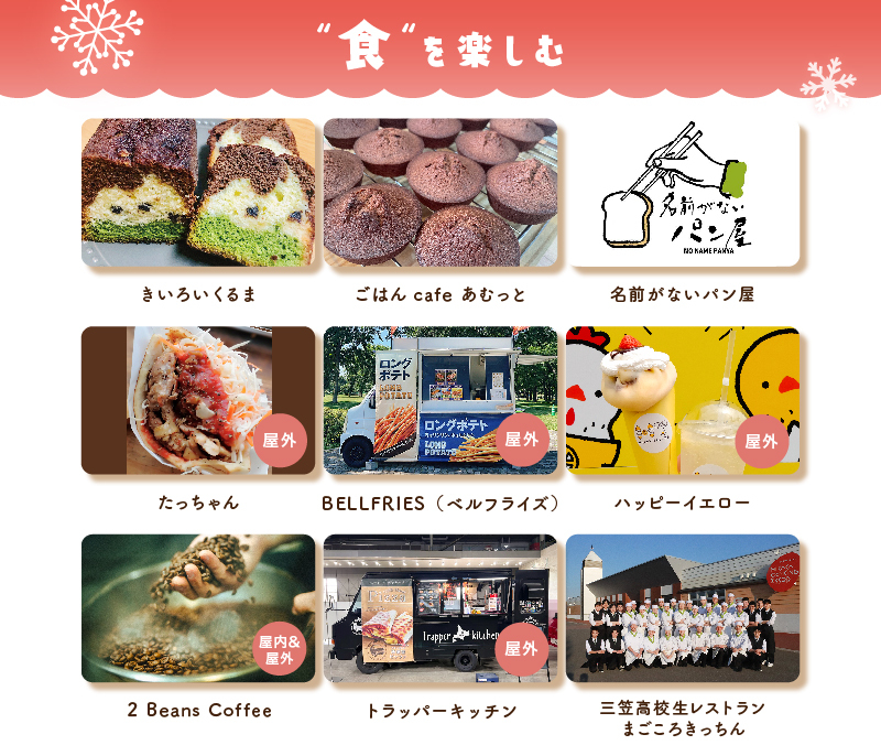 三笠市で人気の飲食店9店が、屋内外で出店決定! 三笠高校の調理部が運営する話題の高校生レストラン「まごころきっちん」からは一日限りのレストランが出現します。三笠の食の魅力が大集結しますので、ご期待ください。