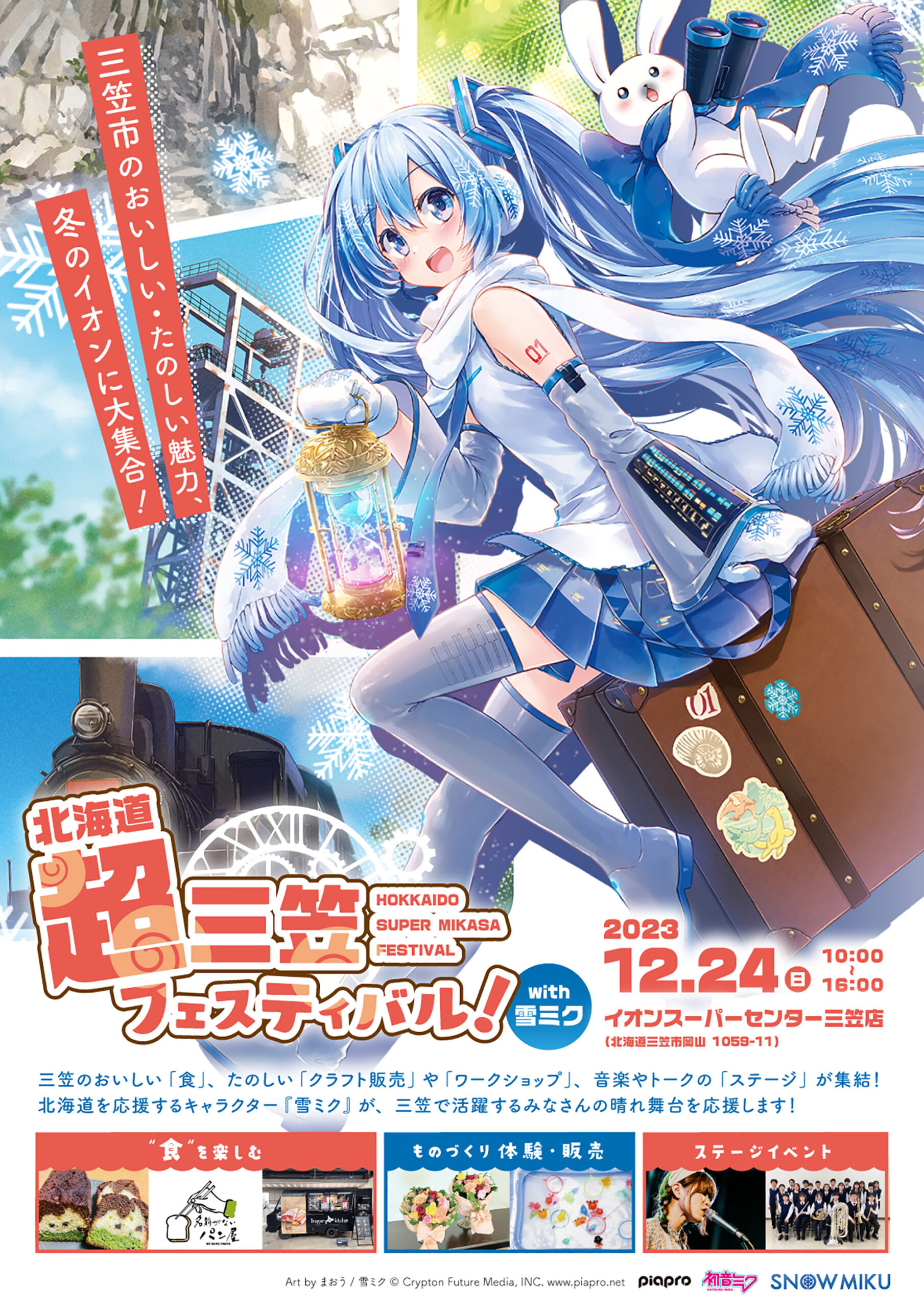 クリプトン・フューチャー・メディア株式会社(本社:北海道札幌市、代表取締役:伊藤博之、以下クリプトン)は、2023年12月24日(日)に、北海道三笠観光協会・三笠市との共催で「北海道超三笠フェスティバル! with 雪ミク」を実施いたします。三笠のおいしい「食」、たのしい「クラフト販売」や「ワークショップ」、音楽やトークの「ステージ」などが、イオンスーパーセンター三笠店に大集合! 食のスペシャリストを志す北海道三笠高等学校(以下、三笠高校)の生徒達が運営するレストラン「まごころきっちん」の出張店が一日限定オープンする他、三笠から生まれたクリエイティビティあふれる様々な取り組みをお楽しみいただけます。また、会場には北海道を応援するキャラクター『雪ミク』&『ラビット・ユキネ』が三笠市の応援に駆けつけます。