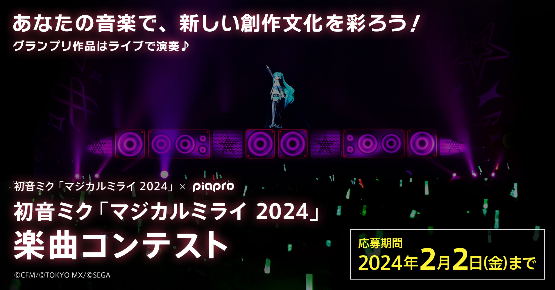 『初音ミク「マジカルミライ 2024」』開催に向けて、バーチャル・シンガー『初音ミク』『鏡音リン』『鏡音レン』『巡音ルカ』『MEIKO』『KAITO』のいずれかが単独で歌う楽曲を募集いたします!