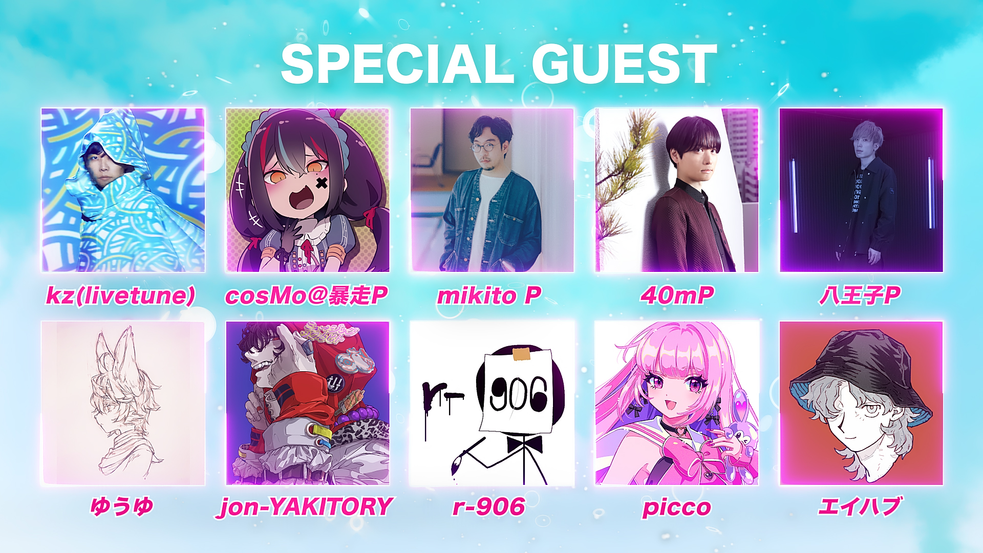 kz(livetune)、cosMo@暴走P、mikito P、40mP、八王子P、ゆうゆ、jon-YAKITORY、r-906、picco、エイハブ、and more…