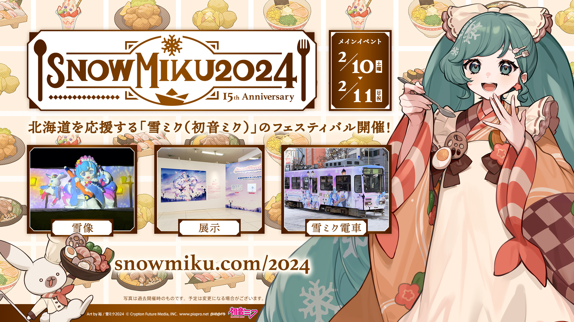 クリプトン・フューチャー・メディア株式会社(本社:北海道札幌市、代表取締役:伊藤博之)は、『雪ミク(初音ミク)』が北海道を応援するフェスティバル「SNOW MIKU 2024」のメインイベントを、2024年2月10日(土)・11日(日・祝)にウイングベイ小樽で開催いたします。記念すべき15年目の開催となる今回、『雪ミク』は「北海道の冬をイメージした“ごちそう”」をテーマにした衣装で展開いたします! 毎年恒例の展示企画やワークショップ、ステージ企画、さっぽろ雪まつり会場での雪像展示に加え、衣装テーマにちなんだ”ごちそう”とのコラボレーション企画もご用意しております。各種コラボレーション企画はメインイベントの前後もお楽しみいただけますので、札幌・小樽にお立ち寄りの皆さまはぜひご参加ください。