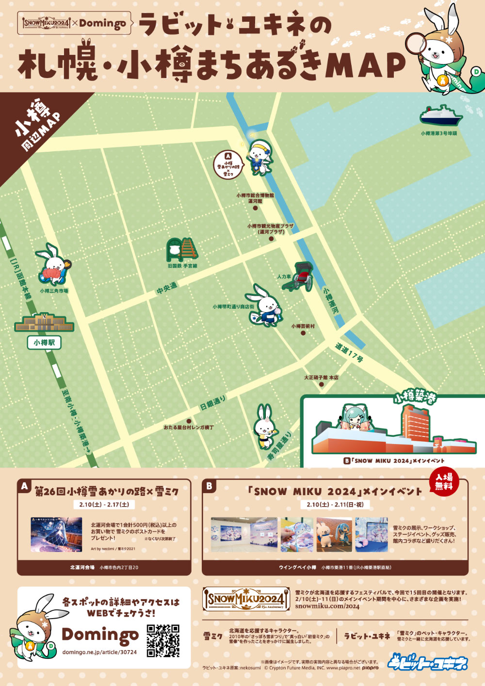 北海道の地域情報に特化したメディア・プラットフォーム「Domingo(ドミンゴ)」から、「ラビット・ユキネの札幌・小樽まちあるきMAP」をご提供中です。『雪ミク』のペットキャラクター『ラビット・ユキネ』が、「SNOW MIKU 2024」や『雪ミク』『初音ミク』に関するさまざまな催しはもちろん、札幌・小樽の観光スポットの数々をご紹介しております。各所でフライヤーとして配布中のほか、WEBページからもマップ閲覧とダウンロードが可能です。札幌・小樽を巡る際には、ぜひお手元にお持ちください!