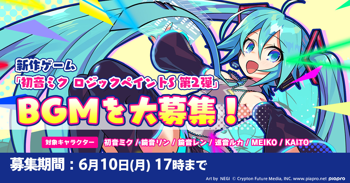 クリプトン・フューチャー・メディア株式会社(本社:北海道札幌市、代表取締役:伊藤博之、以下クリプトン)は、コンテンツ投稿サイト「piapro(ピアプロ)」の公募企画として、自社で制作している新作パズルゲームのBGM募集を開始いたしました。2024年6月10日(月)17:00まで、クリプトンが展開するバーチャル・シンガーたち(初音ミク、鏡音リン、鏡音レン、巡音ルカ、MEIKO、KAITO)をボーカルに起用した楽曲を募集いたします。審査を経て採用となった楽曲は「初音ミク ロジックペイントS」の第2弾として開発中の新作パズルゲームに収録予定です。奮ってご応募ください!