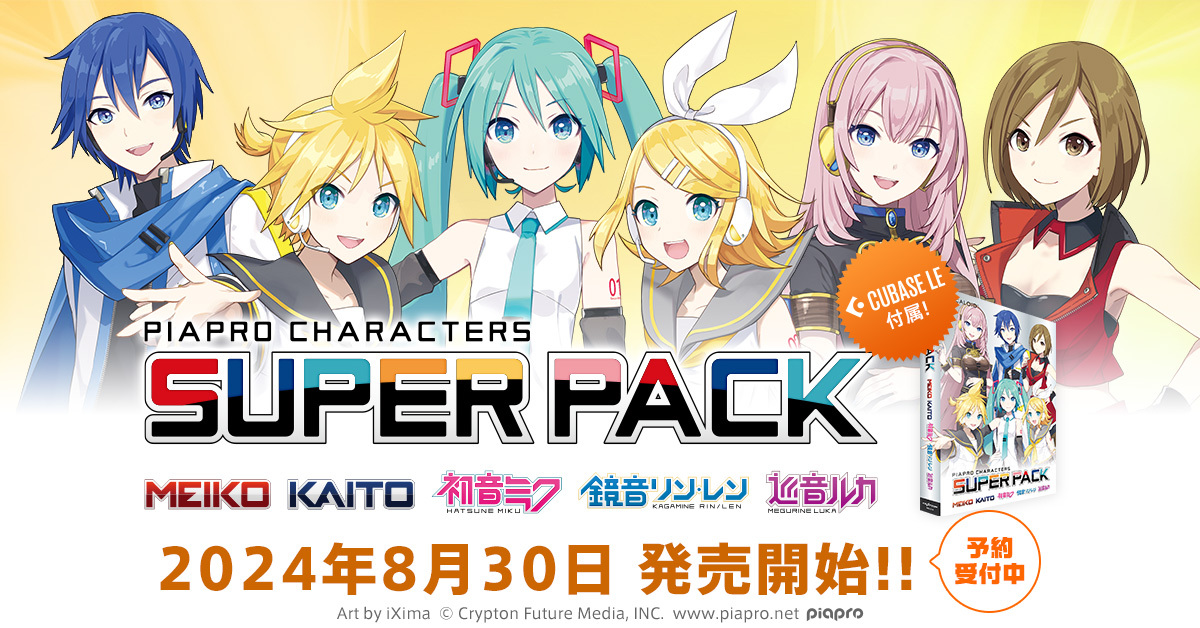 クリプトン・フューチャー・メディア株式会社(本社:北海道札幌市、代表取締役:伊藤博之、以下クリプトン)は、2024年8月30日(金)のリリースに向けて、新製品「PIAPRO CHARACTERS SUPER PACK(ピアプロキャラクターズ・スーパーパック)」(以下「スーパーパック」)の予約受付を開始いたしました。『初音ミク』『鏡音リン』『鏡音レン』『巡音ルカ』『MEIKO』『KAITO』以上6名のバーチャルシンガーたちの代表的な日本語VOCALOIDライブラリを各1種類ずつ収録した歌声合成ソフトウェアで、VOCALOIDエンジンを使用したクリプトン製バーチャルシンガー・ソフトウェアのベスト盤とも呼べるパッケージです。「スーパーパック」の予約購入ならびに本日公開された歌声デモンストレーション動画については、デジタルクリエイター向けダウンロードストア「SONICWIRE(ソニックワイヤ)」上の特設ページからご確認いただけます。