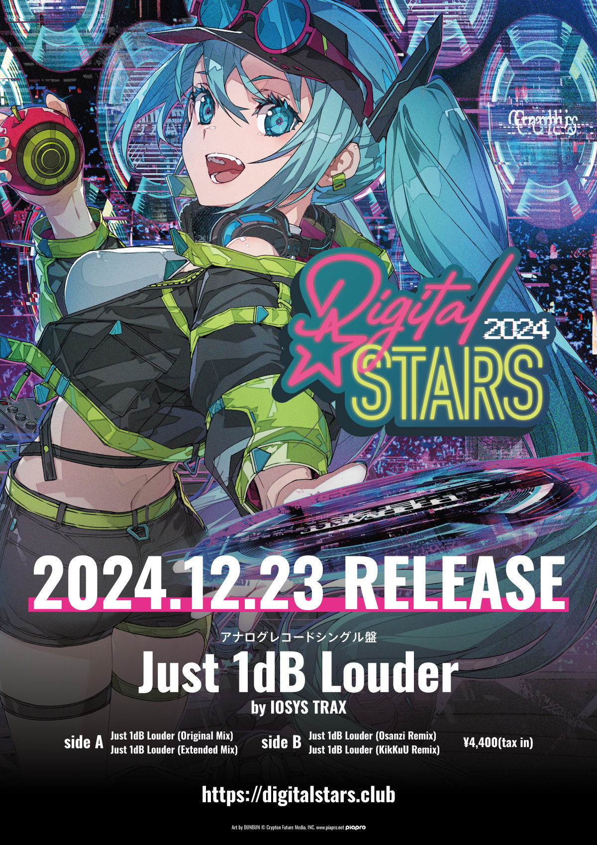 クリプトン・フューチャー・メディア株式会社(本社:北海道札幌市、代表取締役:伊藤博之)が展開する音楽を軸としたカルチャーミックスプロジェクト「Digital Stars」より、プロジェクト初となるアナログレコードの発売が決定いたしました。収録されているのは、「Digital Stars 2024」のテーマソングとしてIOSYS TRAXさんに制作いただいた楽曲『Just 1dB Louder』です。2024年12月23日(月)の発売に向けて、本日より予約受付を開始いたしました。