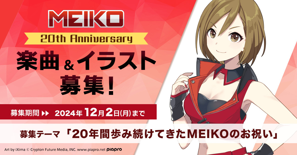 クリプトンでは『MEIKO』の20周年を記念して、コンテンツ投稿サイト「piapro(ピアプロ)」上で、「20年間歩み続けてきたMEIKOのお祝い」をテーマにした楽曲とイラストを公募いたします。採用作品は、今後予定されている「MEIKO 20th Anniversary」関連企画で使用させていただきます。本日より2024年12月2日(月)17:00まで募集いたしますので、ぜひ奮ってご応募ください。