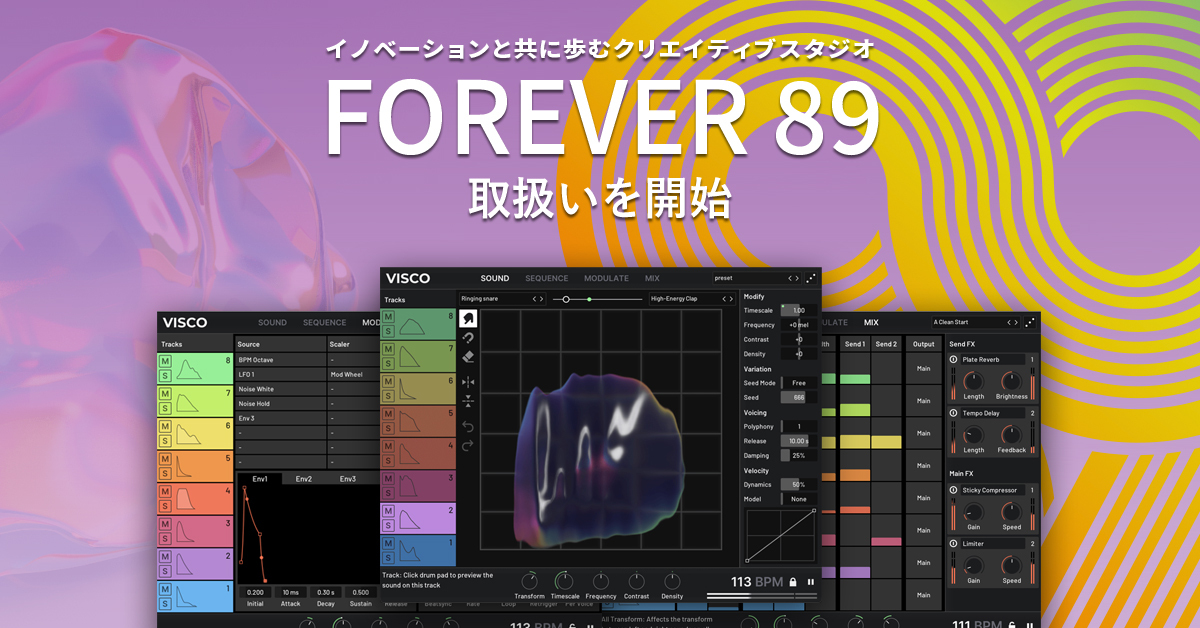 この度ローンチ記念セールの対象となる 『VISCO』は、「FOREVER 89」最初のプロダクトとなる音楽ソフトです。電子音から生楽器まで、読み込んだあらゆるサンプルを ブロブ と名付けられた粘土状の仮想オブジェクトへモデリング。これを2Dグリッド上で掴んだり、引っ張ったり、まさに粘土をこねるような直感的な操作でサウンドを形成していく事が可能なドラムマシンです。音声データを編集するのではなく、構築したモデルに従ってサウンドを生成する手法のため、読み込んだサンプルとは全く別種のサウンドを創り上げることができます。従来のドラムマシンとは一線を画す『VISCO』は、専門知識を不要とする柔軟性の高い設計により、快適かつ、驚きや発見をもたらすようなサウンドデザインを実現します。