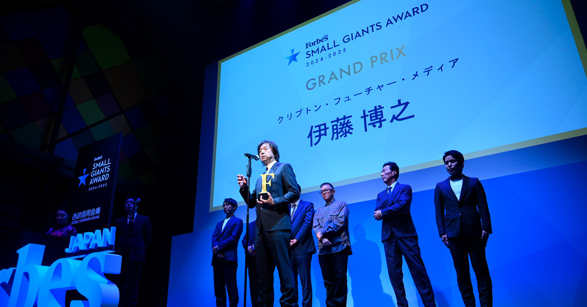 クリプトン・フューチャー・メディア株式会社(本社:北海道札幌市、代表取締役:伊藤博之)は、このたびForbes JAPANが主催する、「Forbes JAPAN SMALL GIANTS AWARD 2024-2025」において、全国150社以上の候補企業の中からファイナリスト7社に選出され、2024年11月25日(月)に開催された本アワードにてグランプリとグローバル賞を受賞いたしました。