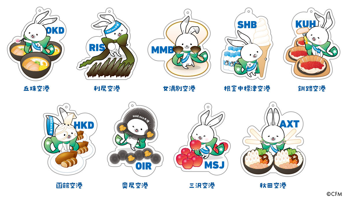 HAC運航便にご搭乗の上、空港フォトスポットで撮影した写真を客室乗務員に提示してくださった方に、“出発地”をモチーフにした特製キーホルダーをその場でプレゼントいたします。フォトパネルと同じ各地の特産品をモチーフにしたイラストに各空港の3レターが加えられた、空旅の思い出にピッタリなデザインです。