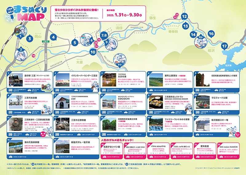 三笠市内でまちの散策に活用いただける「三笠市×雪ミク まちめぐりマップ」を配布いたします。三笠市の観光名所や人気のグルメ店等、23ヶ所のおすすめスポットを雪ミクが紹介しております。マップを片手に、三笠市内の周遊を楽しみましょう!