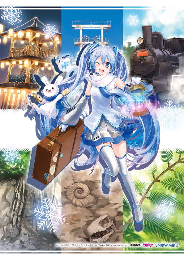 キャンペーンのメインビジュアルは、前回に引き続きイラストレーター・まおうさんにご担当いただきました。石炭と鉄道の発祥の地として栄えた「一億年の時間旅行ができるまち」として知られる三笠市の名所を、雪ミクがペットキャラクターのラビット・ユキネと旅しています。