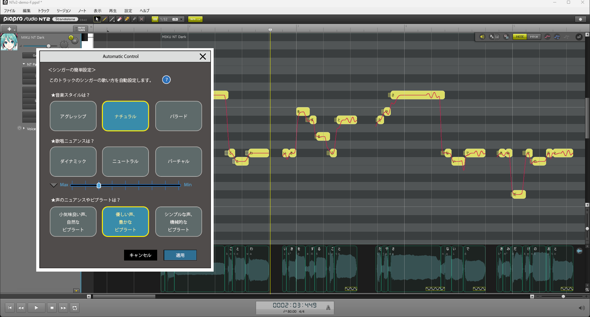 『初音ミク NT(Ver.2)』には、好みの歌わせ方を簡単操作で実現する支援機構「Automatic Control」を新たに搭載いたします。歌唱スタイルやニュアンスなど、あらかじめ用意されたいくつかの項目を選択していくだけで、ピッチカーブ、ビブラート、子音長やVoice Colorといった複数の調整項目を、その詳細を意識することなく設定できる機能です。また、そこにクリエイターが自由な調整を加えることもできるため、理想の歌声をより簡単に表現できるようになります。