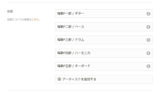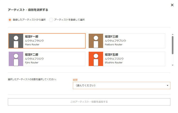 今回、新たに公開された「アーティスト機能」(*1)では、アーティスト情報を複数登録できる上、アーティスト別に約50の役割(プロデューサー、リミキサー、エンジニア、楽器演奏者、など)を選択できるようになりました。また、アーティスト情報については事前に登録しておく事ができるため、一度登録してしまえば楽曲の配信登録時には選択するだけでスムーズに進めることも可能です。