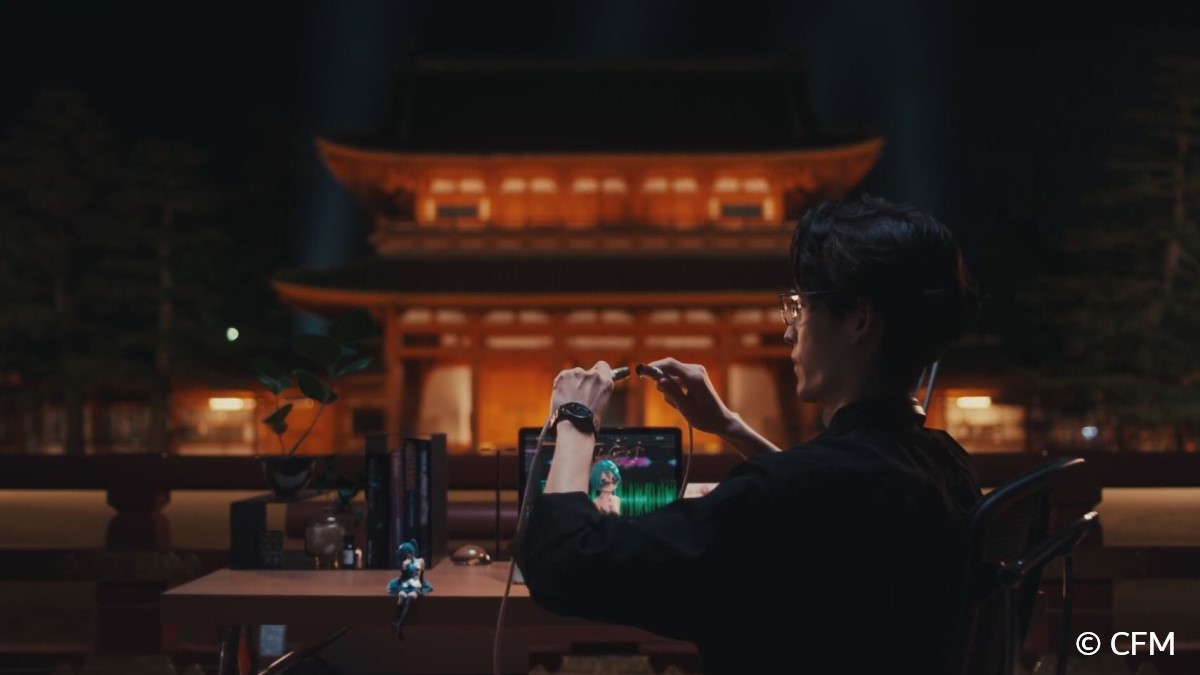 授賞式の開催地である京都を舞台に初音ミクが歌唱するシーンの音楽はr-906さんに制作していただき、映像にも共にご出演いただきました。また、今回のパフォーマンスのために新規制作した初音ミクの3DCGモデルはYellow Magic Orchestraのアルバムジャケットをオマージュしたデザイン(*2)となっており、初音ミクが手に持つ扇子にもリスペクトを込めた演出が仕掛けられていました。