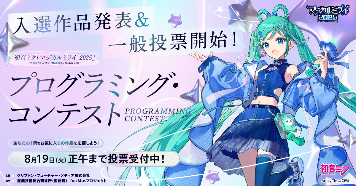 クリプトン・フューチャー・メディア株式会社(本社:北海道札幌市、代表取締役:伊藤博之、以下クリプトン)は、2025年8月9日(土)に、現在開催中の『初音ミク「マジカルミライ 2025」プログラミング・コンテスト』における入選作品を発表いたしました。本コンテストの受賞作品は、入選作品の発表と同時にスタートした一般投票を経て最終決定となります。投票の受付期限は2025年8月19日(火)正午です。