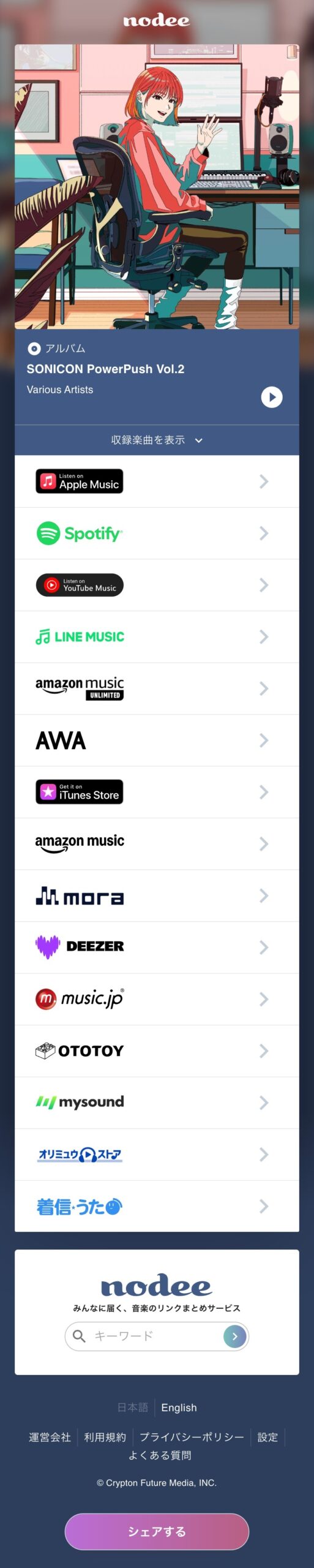 クリプトン・フューチャー・メディア株式会社(本社:北海道札幌市、代表取締役:伊藤博之、以下クリプトン)は、2025年12月に一般公開した音楽リンクまとめサービス「nodee(ノーディー)」のアップデートを実施いたしました。本アップデートにより、これまで一部ユーザー向けに先行提供していた「二次元コード取得機能」を一般解禁し、すべてのユーザーが音楽を印刷したり貼ったりすることを可能にしました。「nodee」は1億曲以上の音楽作品を網羅しているため、音楽サービスで配信されている楽曲であればジャンルを問わず見つかります。皆さまの“推し曲”をシェアする新ツールとして、ぜひお役立てください。