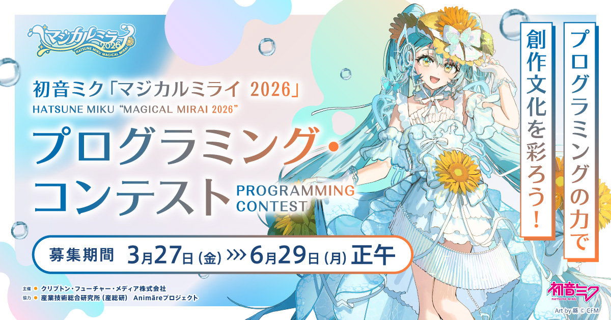 クリプトン・フューチャー・メディア株式会社(本社:北海道札幌市、代表取締役:伊藤博之、以下「クリプトン」)は、国立研究開発法人産業技術総合研究所(以下「産総研」)の協力の下、イベント『初音ミク「マジカルミライ 2026」』(以下「マジカルミライ 2026」)の一環として、プログラミング・コンテストを開催いたします。募集する作品は、本コンテストの対象楽曲にあわせて動くWebアプリケーション(リリックアプリ)です。2026年6月29日(月)正午まで募集いたしますので、プログラミングにご興味のある方は、ぜひこの機会にご参加ください。