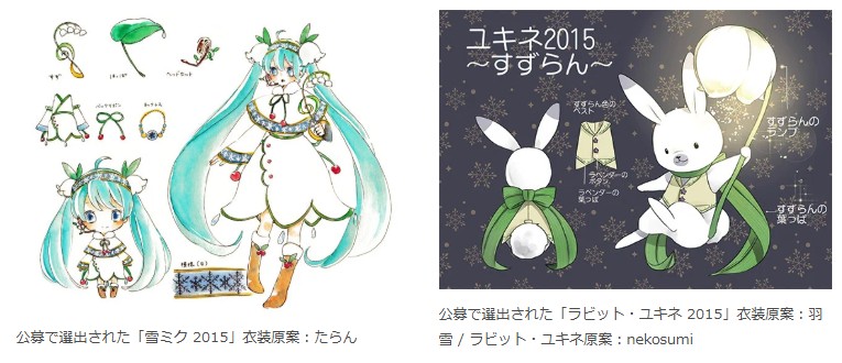 『雪ミク』は、バーチャルシンガー『初音ミク』から派生した“北海道を応援するキャラクター”です。毎冬、北海道の観光等を盛り上げる目的で「SNOW MIKU」というフェスティバルを開催しており、同フェスティバルで『雪ミク』とペットキャラクターの『ラビット・ユキネ』が着用する衣装デザインを、テーマを指定した公募にて決定しております。