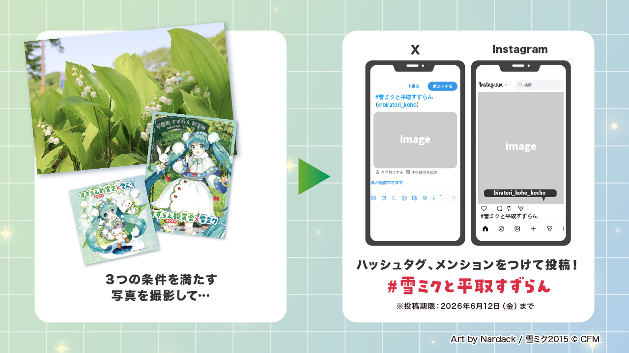 ③撮影した写真を、平取町公式アカウント(X:@biratori_koho / Instagram:@biratori_koho_kocho)へのメンションを含めた上で、ハッシュタグ「#雪ミクと平取すずらん」を付けて投稿すれば、キャンペーン参加完了!